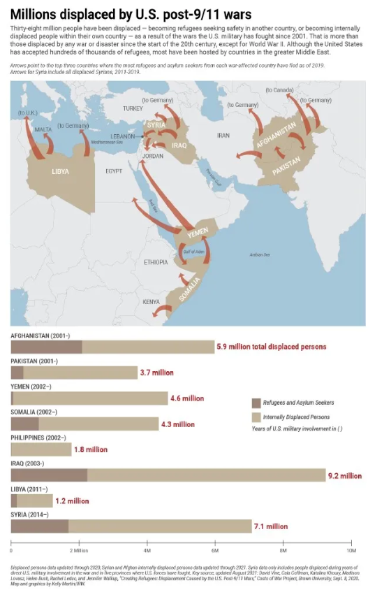 Brown University ha scoperto che le guerre degli Stati Uniti successive all’11 settembre hanno causato lo sfollamento di almeno 38 milioni di persone , più di qualsiasi altro conflitto dal 1900, esclusa la Seconda guerra mondiale.