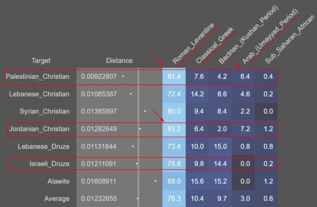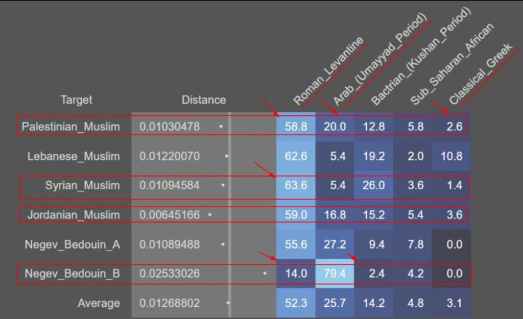 Nella prima diapositiva (rilevante per gli israeliti), si noti come i musulmani palestinesi (82,8%) siano molto più vicini agli israeliti rispetto ai cristiani palestinesi (80,4%) e ai drusi palestinesi (74,4%). D’altra parte, nella terza diapositiva (rilevante per il periodo romano), la quota di musulmani nel Levante è inferiore, al 58,8%, rispetto ai cristiani, all’81,4%. Questi fatti ci inducono a chiederci: è possibile che i musulmani palestinesi si siano convertiti direttamente dall’ebraismo più recentemente di quanto comunemente si creda? È possibile che i matrimoni misti , tra uomini musulmani e donne ebree, fossero molto più comuni di quanto si creda? L’autore di queste righe ne è una prova vivente!