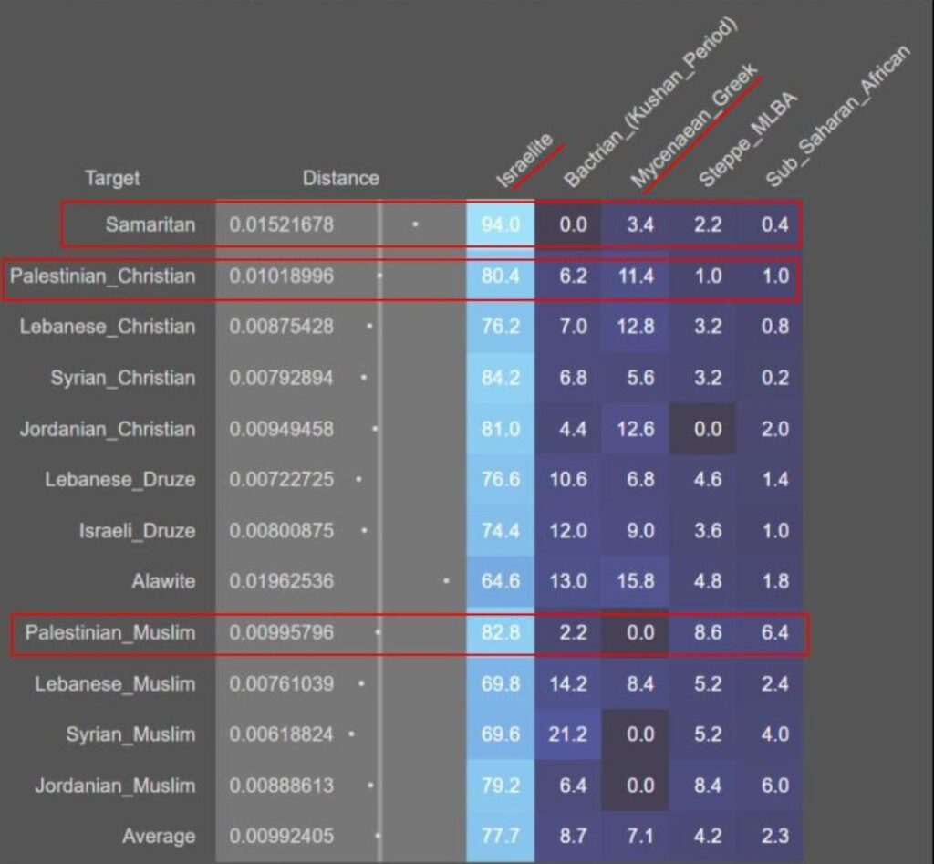 Ecco la distanza genetica  tra  Israeliti (100%)  e  Samaritani  (al 94%), Cristiani e Musulmani Palestinesi (rispettivamente all’80,4% e all’82,8%), Ashkenazi (al 35%) e comunità ebraiche sefardite (al 44%), estratta  dal  thread  X  Cyo  sulla genetica  .