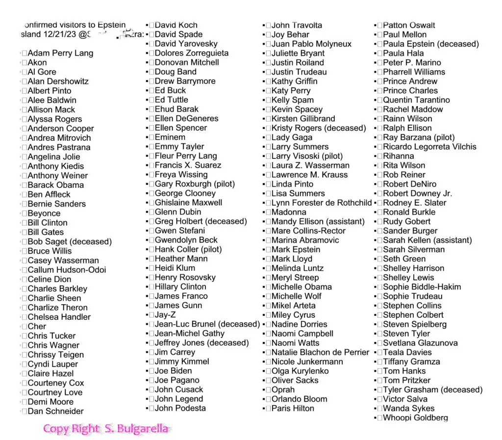 Riportiamo dal nostro archivio del 2022 I Visitatori certificati, dell’Isola dei Pedofili di EPSTEIN