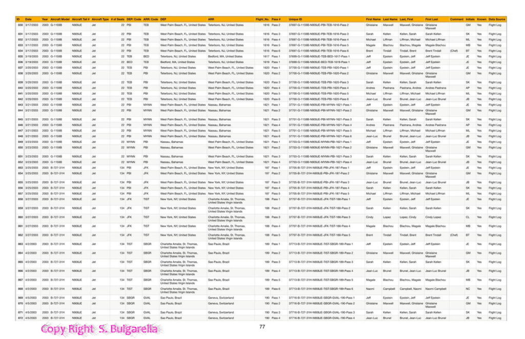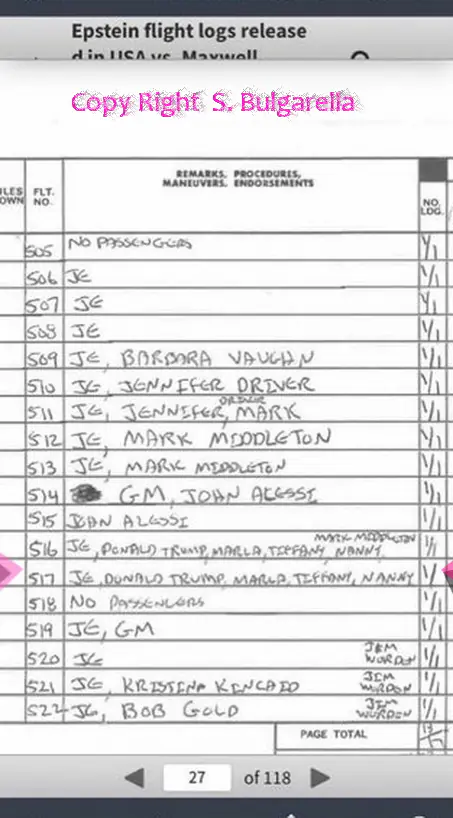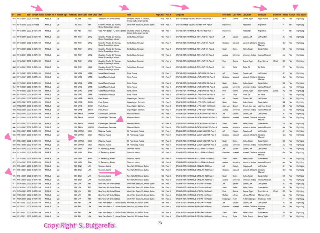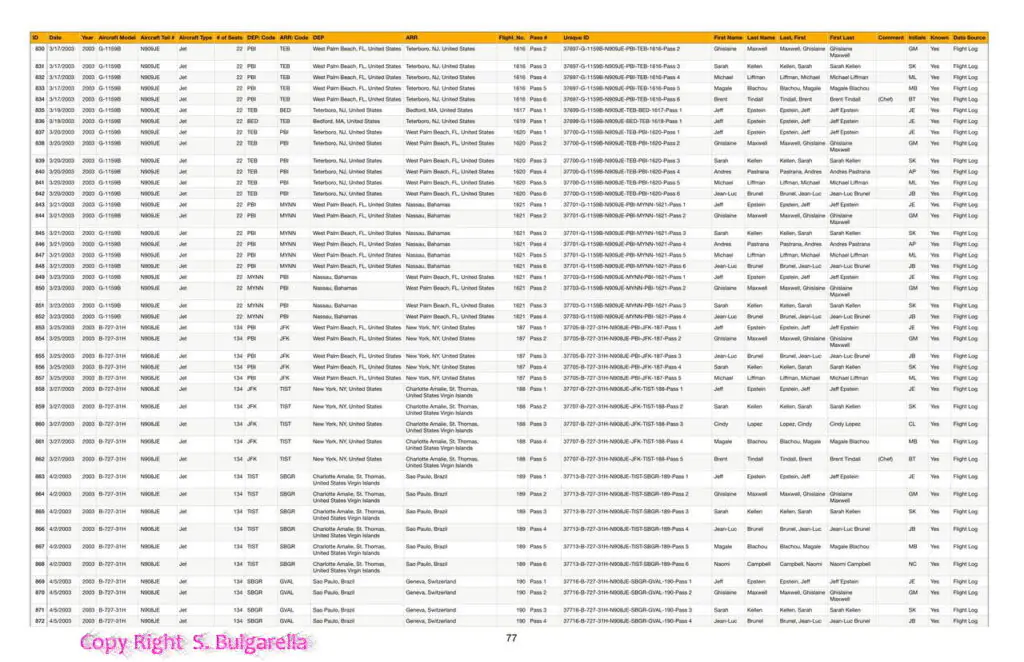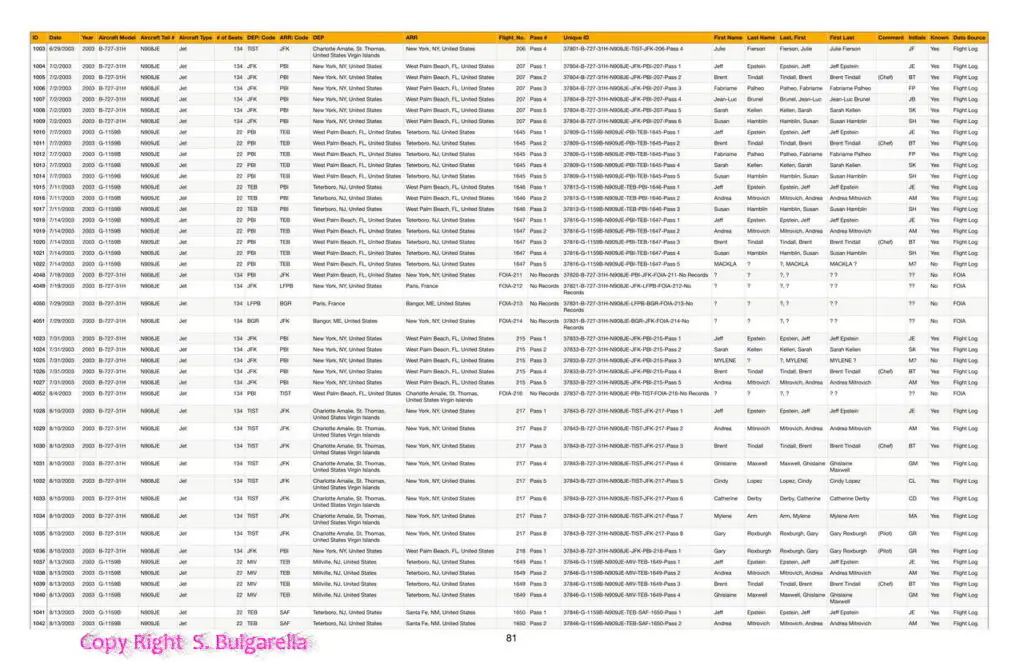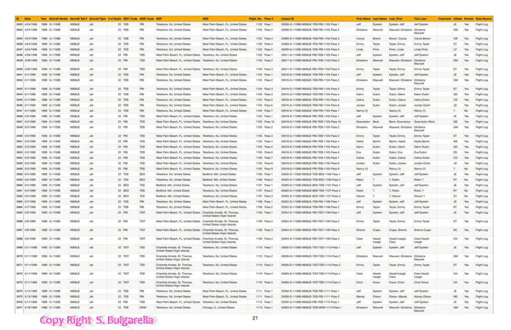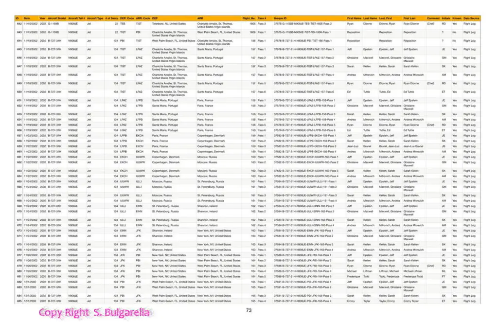 Riportiamo di seguito alcuni documenti, acquisiti dai DATABASE ORIFINALI di EPSTEIN E DELLA MAXWELL,  completi di Nome, Accompagnatori, DATA, Luogo di partenze. Pilota Aereo, Tipo Di aereo, data ritorno.  etc etc.  Ne siamo entrati in possesso nel 2022 qualche mese dopo il suicidio stranissimo di Epstein. Buona lettura