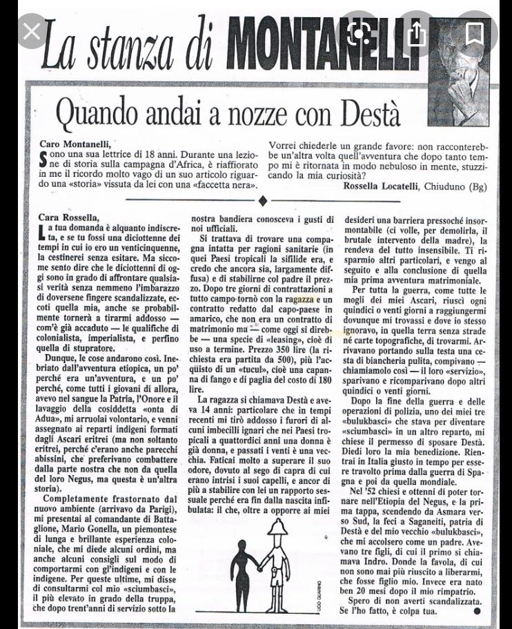 Quello che fece Montanelli si chiamava “madamato” ed era una pratica molto in voga nel 1936; tutti i fascisti avevano la propria madama minorenne dentro al letto. Montanelli acquistò una moglie dodicenne (12 ANNI) durante la stagione del colonialismo fascista in Eritrea.“aveva dodici anni, ma non mi prendere per un Girolimoni ( famoso pedofilo arrestato all’epoca), a dodici anni quelle lì erano già donne. L’avevo comprata a Saganeiti assieme a un cavallo e un fucile, tutto a 500 lire. Era un animalino docile, io gli  misi su un tucul (semplice edificio a pianta circolare con tetto conico solitamente di argilla e paglia) con dei polli. E poi ogni quindici giorni mi raggiungeva dovunque fossi insieme alle mogli degli altri ascari“.