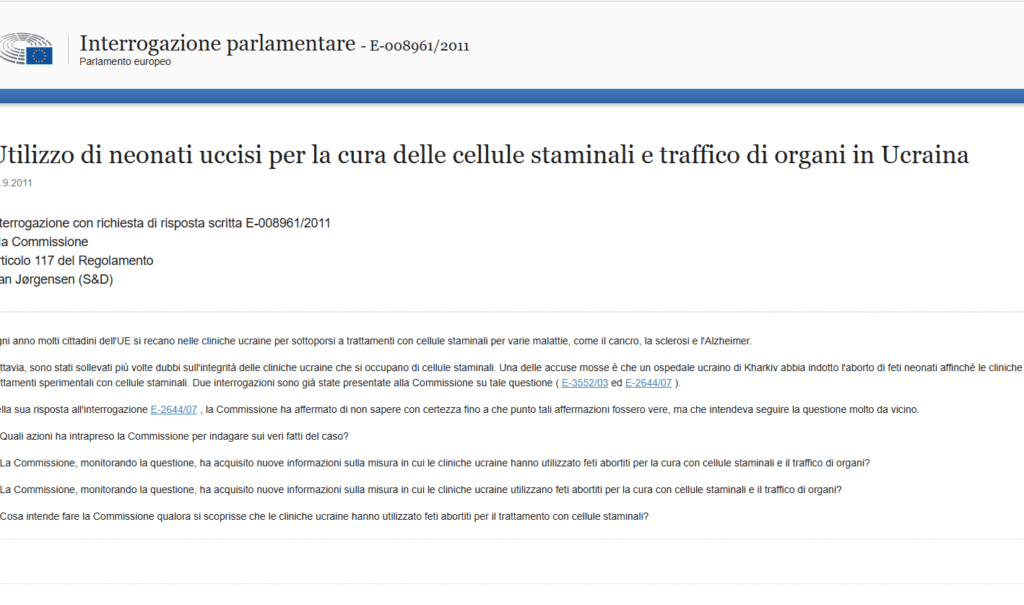 4. Cosa propone la Commissione di fare qualora risulti che le cliniche ucraine hanno utilizzato feti abortiti per il trattamento con cellule staminali? La Commissione fu interpellata nuovamente nel 2011 (https://www.europarl.europa.eu/doceo/document/E-7-2011-008961_EN.html), e non diede risposta dirimente.