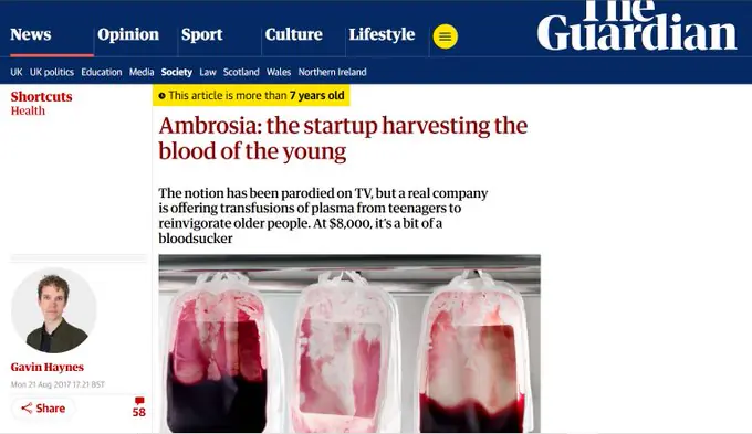 Non è un caso che il suo progetto abbia sede vicino a San Francisco. L’idea è diventata di moda negli ambienti tecnologici. Mentre i prodotti anti-età di solito riscuotono più successo tra le donne, due terzi degli oltre 65 partecipanti che si sono iscritti a questa sperimentazione sono uomini. La sitcom di Mike Judge nella Silicon ValleyGavin Belson che si affida a un “blood boy” che lo segue ovunque per donare pinte di rosso appiccicoso nei momenti più intimi.